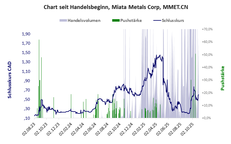 Miata Metals hat ein kritisches Gesamtscoring und ist ein Pennystock mit Kursgewinn. Das Gesamtvermögen ist karg, die Vermögenswerte scheinen nicht vorhanden zu sein, der Umsatz ist nicht existent, die Ertragslage extrem verlustreich, die Geldverbrennung gering.