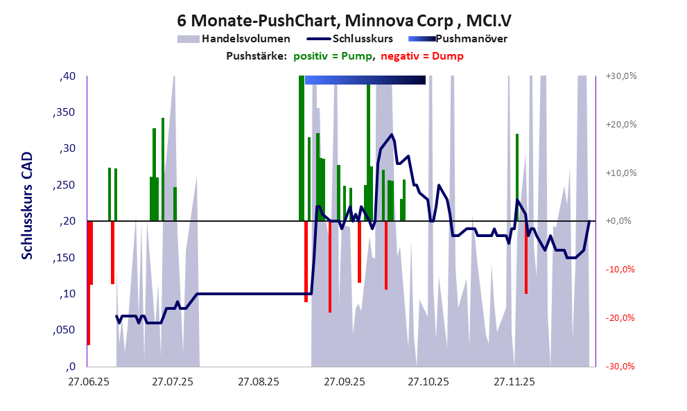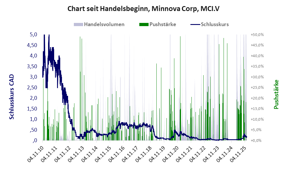 Bei dieser Aktie liegt das „Inkassomodell“ vor, bei dem der Aktienkurs zu Beginn der Geschichte sein Allzeithoch hat. Die Akteure verkaufen schon zu Beginn nach und nach ihre billigst erworbenen Aktien, so dass der Kurs in verhältnismäßig kurzer Zeit abstürzt. Danach dümpelt der Aktienkurs in den meistn Fällen nahe null dahin und die Aktie dient nur noch kleineren, dennoch gewinnbringenden Pushmanövern und in vielen Fällen dem Algotrading. Dem ersten Einbruch nachfolgende größere Pushmanöver sind aber nicht ausgeschlossen.