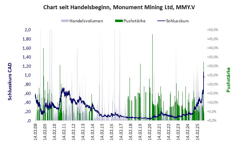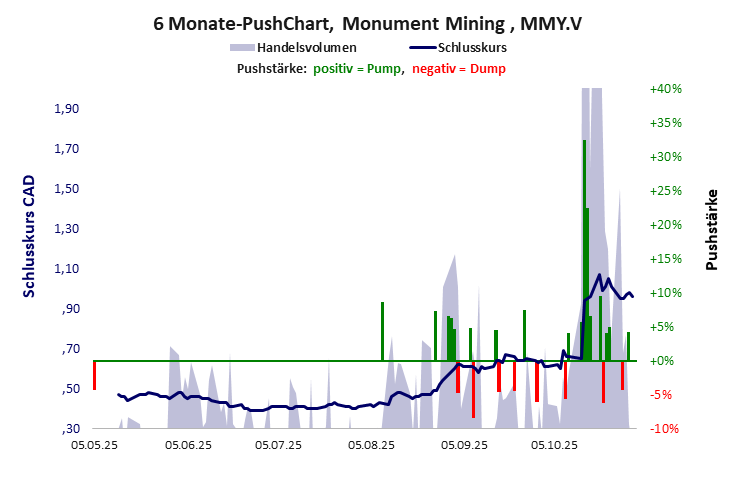 Das einzig störende Element an dieser Aktie sind die permanenten Pushes im Aktienkurs. Sie sind nicht als Pushmanöver zu interpretieren, sondern als hohe Volatilität des Kurses. Trotz des schon bedenklich hohen PushScores kann man anlegen. Monument Mining hat ein akzeptables Gesamtscoring und ist ein Pennystock mit Kursgewinn. Das Gesamtvermögen ist groß, die Vermögenswerte scheinen sehr werthaltig zu sein, der Umsatz ist groß, die Ertragslage , die Geldverbrennung gering.