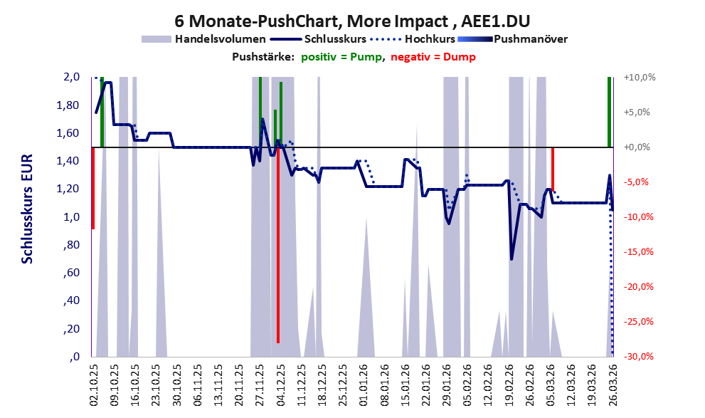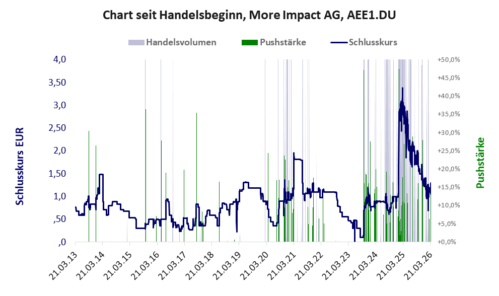 Über diese Aktie berichtet Aktiencheck. Das tägliche Handelsvolumen betrug an obiger Börse während der letzten drei Monate bis Berichtsdatum: 393 Stück, das sind 0,0% der ausgegebenen Aktien. Bei More Impact fehlt ein operatives Geschäft, stattdessen wird das Geld der Investoren verbrannt.