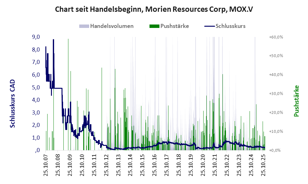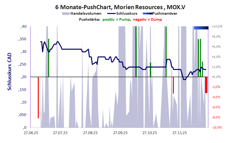 Bei dieser Aktie liegt das „Inkassomodell“ vor, bei dem der Aktienkurs zu Beginn der Geschichte sein Allzeithoch hat. Die Akteure verkaufen schon zu Beginn nach und nach ihre billigst erworbenen Aktien, so dass der Kurs in verhältnismäßig kurzer Zeit abstürzt. Danach dümpelt der Aktienkurs in den meistn Fällen nahe null dahin und die Aktie dient nur noch kleineren, dennoch gewinnbringenden Pushmanövern und in vielen Fällen dem Algotrading. Dem ersten Einbruch nachfolgende größere Pushmanöver sind aber nicht ausgeschlossen.