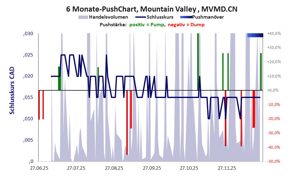 Dieser Aktie liegt das „Refreshmodell“ zu Grunde. Eine Durchsicht aller Geschäftsberichte würde recht sicher zeigen, dass das Unternehmen nie Umsatz und Profit erzielte und die gesamten Explorationskosten unter „Aktiva“ verbuchte. Das heißt, während aller Jahre wurde nichts gefunden, sondern die Investorengelder wurden für erfolglose Explorationsarbeiten verbrannt. Die bescheidene Exploration dient lediglich als Grundlage zur medialen Vermarktung von Erfolgsaussichten, auf eine große Lagerstätte zu stoßen, um damit das nächste Pushmanöver zu befeuern.