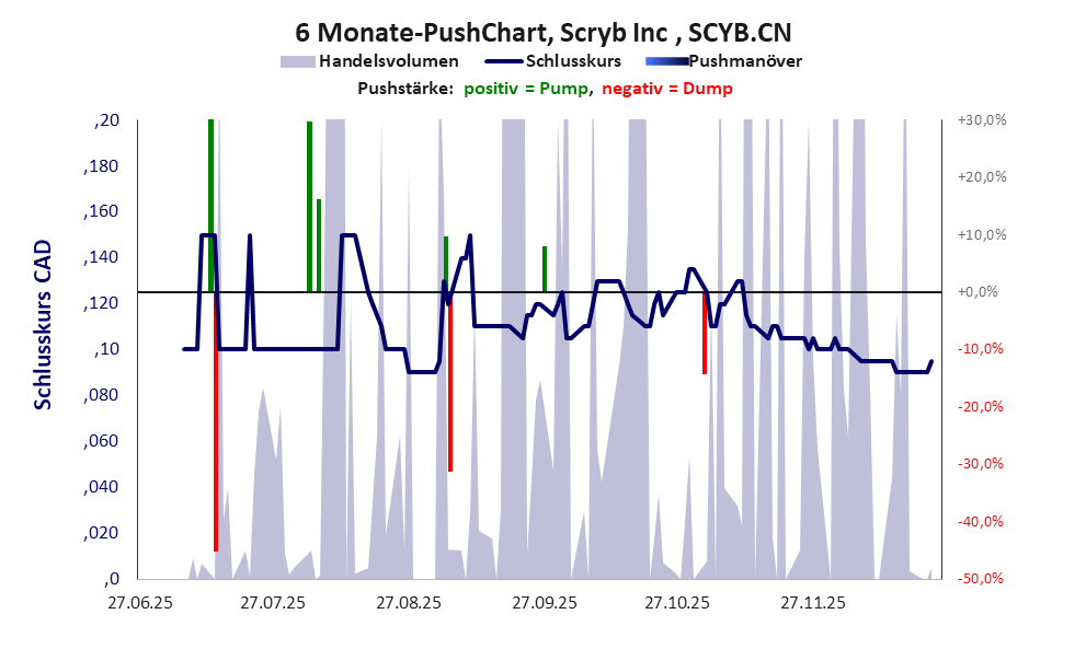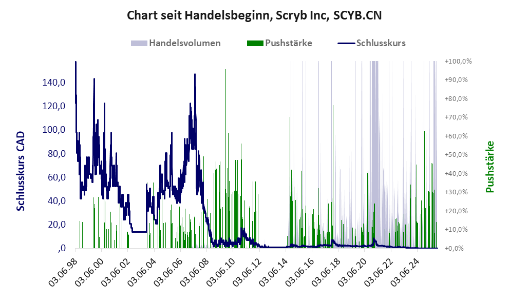 Bei dieser Aktie liegt das „Inkassomodell“ vor, bei dem der Aktienkurs zu Beginn der Geschichte sein Allzeithoch hat. Die Akteure verkaufen schon zu Beginn nach und nach ihre billigst erworbenen Aktien, so dass der Kurs in verhältnismäßig kurzer Zeit abstürzt. Danach dümpelt der Aktienkurs in den meistn Fällen nahe null dahin und die Aktie dient nur noch kleineren, dennoch gewinnbringenden Pushmanövern und in vielen Fällen dem Algotrading. Dem ersten Einbruch nachfolgende größere Pushmanöver sind aber nicht ausgeschlossen. Bei dieser Aktie vollzogen die Akteure mindestens einen Pump & Dump und leerten damit ganz gezielt die Taschen der Anleger. Obwohl das Vorgehen rechtswidrig ist, erfolgt kaum je eine Strafverfolgung.