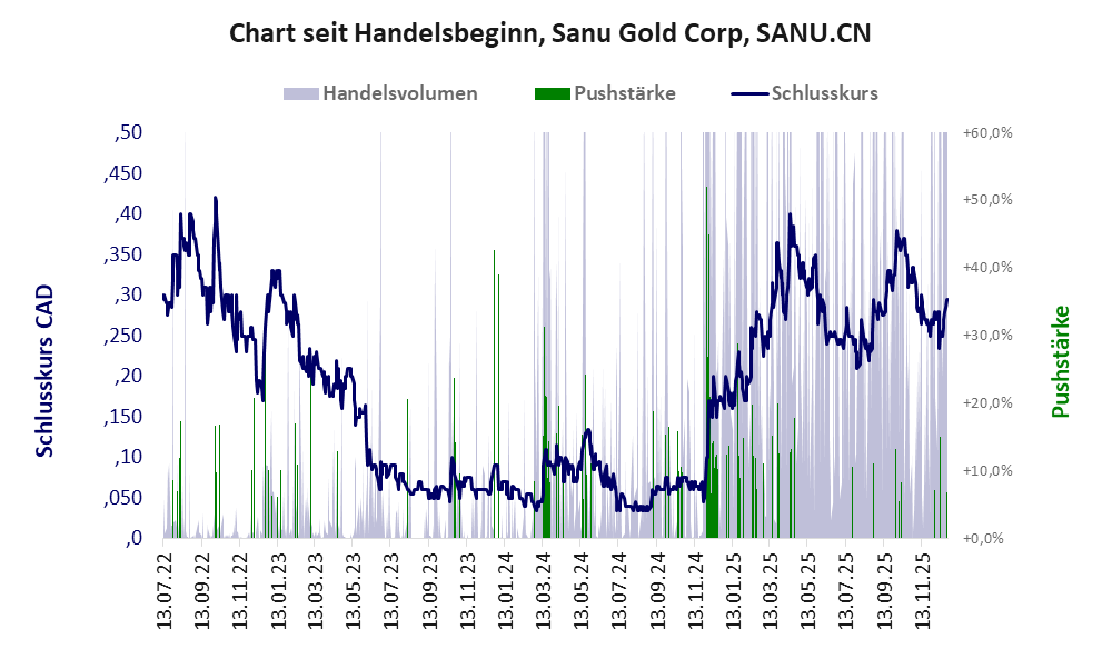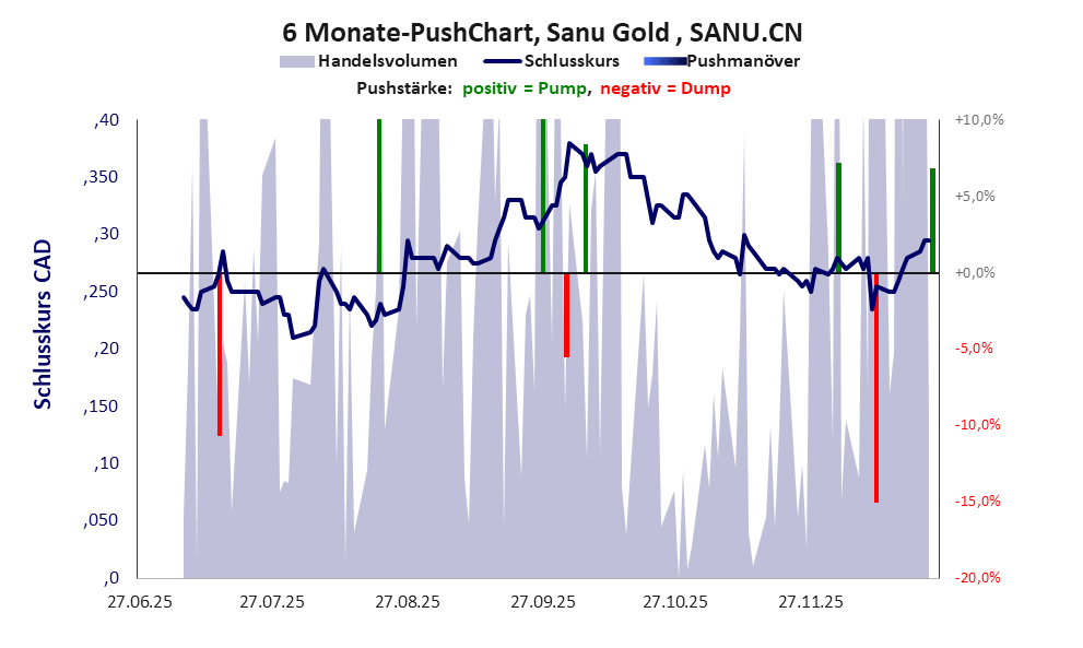 Bei dieser Aktie liegt das „Inkassomodell“ vor, bei dem der Aktienkurs zu Beginn der Geschichte sein Allzeithoch hat. Die Akteure verkaufen schon zu Beginn nach und nach ihre billigst erworbenen Aktien, so dass der Kurs in verhältnismäßig kurzer Zeit abstürzt. Danach dümpelt der Aktienkurs in den meistn Fällen nahe null dahin und die Aktie dient nur noch kleineren, dennoch gewinnbringenden Pushmanövern und in vielen Fällen dem Algotrading. Dem ersten Einbruch nachfolgende größere Pushmanöver sind aber nicht ausgeschlossen.