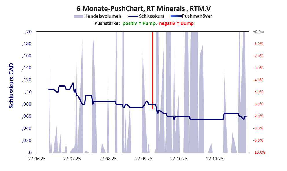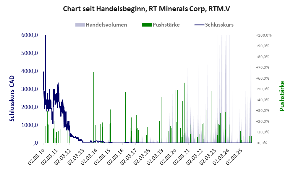 Bei dieser Aktie liegt das „Inkassomodell“ vor, bei dem der Aktienkurs zu Beginn der Geschichte sein Allzeithoch hat. Die Akteure verkaufen schon zu Beginn nach und nach ihre billigst erworbenen Aktien, so dass der Kurs in verhältnismäßig kurzer Zeit abstürzt. Danach dümpelt der Aktienkurs in den meistn Fällen nahe null dahin und die Aktie dient nur noch kleineren, dennoch gewinnbringenden Pushmanövern und in vielen Fällen dem Algotrading. Dem ersten Einbruch nachfolgende größere Pushmanöver sind aber nicht ausgeschlossen.