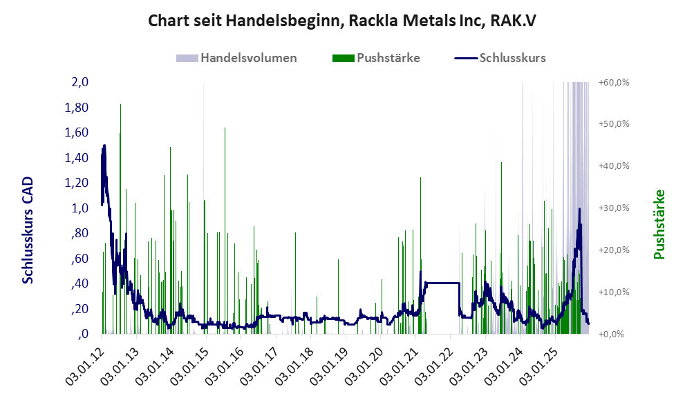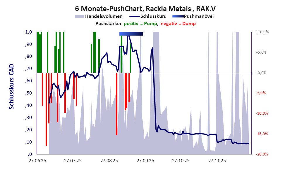 Bei dieser Aktie liegt das „Inkassomodell“ vor, bei dem der Aktienkurs zu Beginn der Geschichte sein Allzeithoch hat. Die Akteure verkaufen schon zu Beginn nach und nach ihre billigst erworbenen Aktien, so dass der Kurs in verhältnismäßig kurzer Zeit abstürzt. Danach dümpelt der Aktienkurs in den meistn Fällen nahe null dahin und die Aktie dient nur noch kleineren, dennoch gewinnbringenden Pushmanövern und in vielen Fällen dem Algotrading. Dem ersten Einbruch nachfolgende größere Pushmanöver sind aber nicht ausgeschlossen.