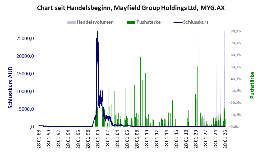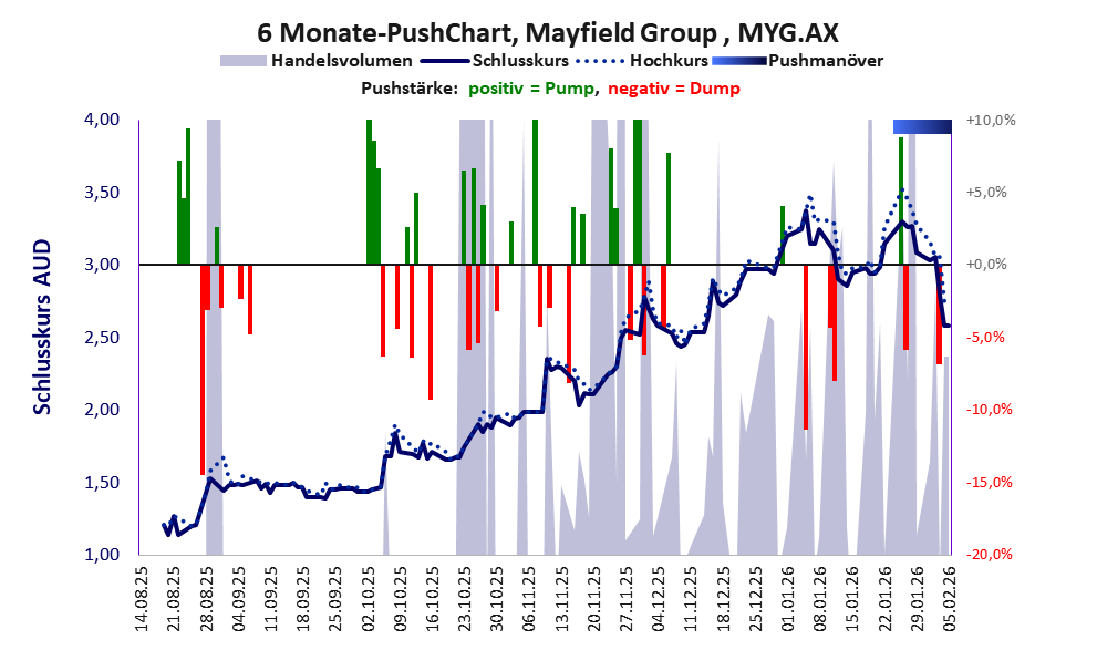 Bei dieser Aktie gibt es 2 Pump & Dump-Manöver. Das tägliche Handelsvolumen während der letzten drei Monate (bis Berichtsdatum) betrug 382.733 Stück, das sind 0,3% der ausgegebenen Aktien.