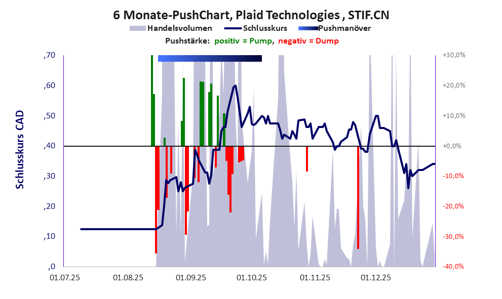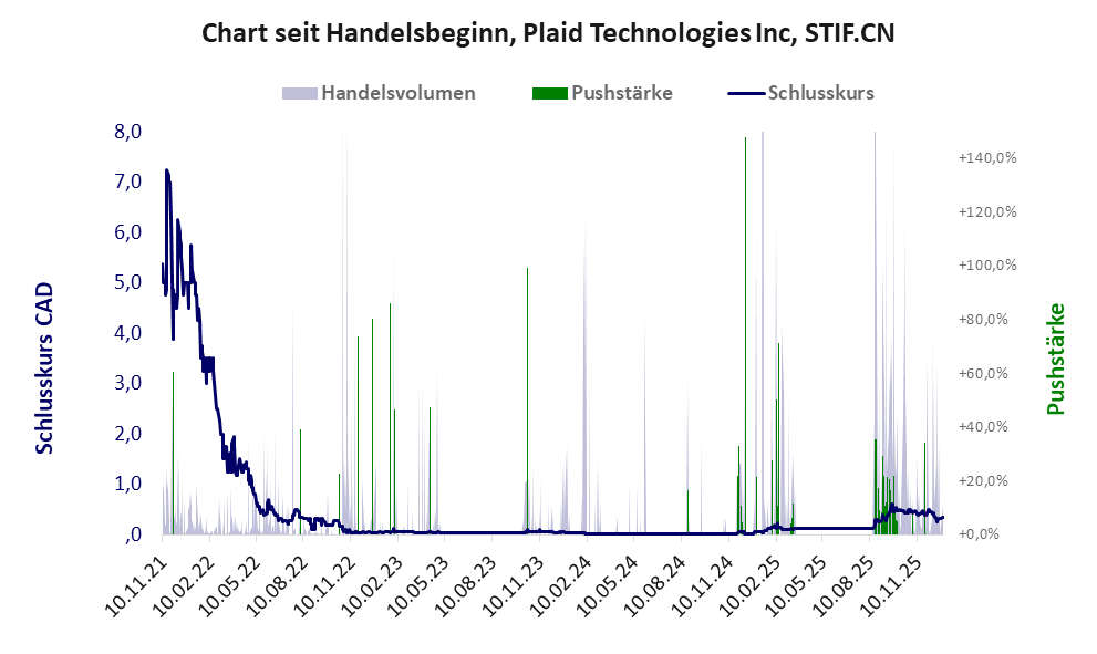 Am 13.02.2025 wurde Veji Holdings Ltd mitten in einem Pushmanöver an der FWB einbezogen. Nach Problemen mit dem Listing an der CSE folgte im August 2025 der Namenswechsel zu Plaid Technologies Inc. Es ist eine wertlose Pusheraktie, deren Kurs nach dem Neustart ordentlich gepusht wird. *** Bei dieser Aktie liegt das „Inkassomodell“ vor.