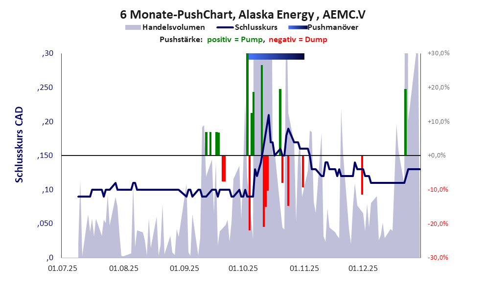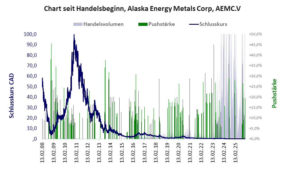 Millrock Resources Inc, Erstinhaberin der Aktie, ist ein prototypisches Beispiel für eine Pusheraktie. Belege für den gigantischen Kursanstieg im Jahr 2009/2010 fehlen zwar, aber interessant ist, dass der Kursanstieg um 3500% bei einem durchschnittlichen Handelsvolumen von nicht einmal 3.000 Stück pro Tag geschah. Da Medienaktivitäten oder andere öffentlichkeitswirksame Impulse als Antriebsfaktoren fehlen, steht ein offenkundiger Verdacht im Raum, es handelte sich damals um Kursmanipulation durch Insider. Mit dem Namenswechsel und dem Beginn der Alaska Energy Metals im März 2023 dürfte der Aktienhandel auf Algotrading umgestellt worden sein, denn das Handelsvolumen stieg um das Fünfzigfache. Kleine Pushes finden weiter statt, aber selbst Zocker werden bei den extrem kurzfristigen Kursänderungen nicht fündig werden. Die Aktie wird ihr Ende finden, wenn auch das Algotrading keine Gewinne mehr abwirft.