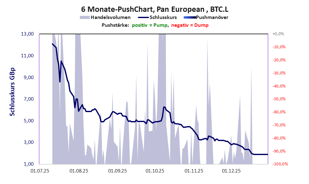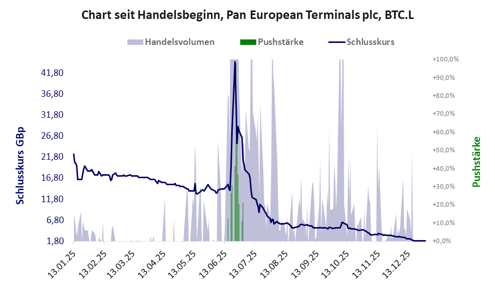 Pan European Terminals entstand aus der Vinanz Ltd, die mit einem PushScore von 1978 und einem FinanzScore von 1751 Punkten deutlich schlechter war. Mit dem Namenswechsel wurde die Aktie entweder neu aufgelegt oder 100:1 konsolidiert. Werthaltigkeit liegt in keinem Fall vor. *** Es gab 1 Pump&Dump-Manöver.