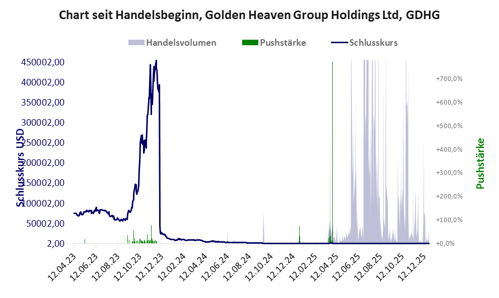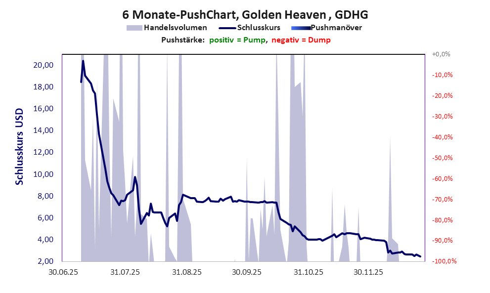 Golden Heaven zählt zu einer Gruppe chinesischer Firmen deren Aktien in den USA oder auf den Antillen beheimatet sind und die auf der Warnliste der BaFin stehen. Der Aktienkurs dieser Firmen zeigt schlagartig durchgeführte Dumps, mit denen die Anleger (oft in Chatgruppen organisiert) um ihr Geld betrogen wurden. Die Geschichte, wie abgezockt wird, steht unter „Am Handy abgezockt„. Bei dieser Aktie vollzogen die Akteure mindestens einen Pump & Dump und leerten damit ganz gezielt die Taschen der Anleger. Obwohl das Vorgehen rechtswidrig ist, erfolgt kaum je eine Strafverfolgung.