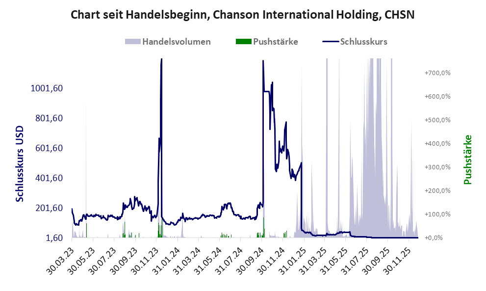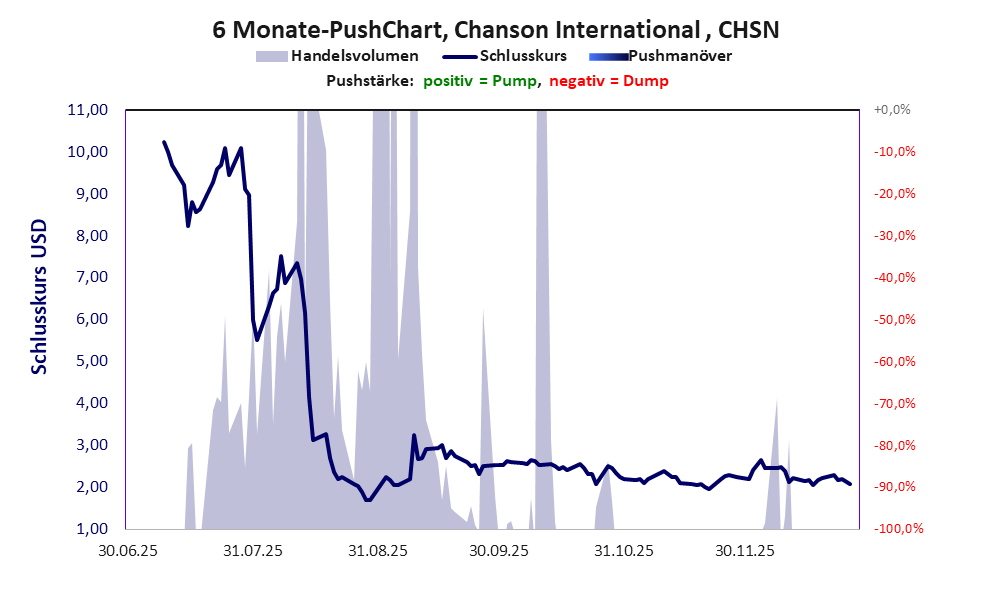 Chanson zählt zu einer Gruppe chinesischer Firmen deren Aktien in den USA oder auf den Antillen beheimatet sind und die auf der Warnliste der BaFin stehen. Der Aktienkurs dieser Firmen zeigt schlagartig durchgeführte Dumps, mit denen die Anleger (oft in Chatgruppen organisiert) um ihr Geld betrogen wurden. Die Geschichte, wie abgezockt wird, steht unter „Am Handy abgezockt„. Bei dieser Aktie vollzogen die Akteure mindestens einen Pump & Dump und leerten damit ganz gezielt die Taschen der Anleger. Obwohl das Vorgehen rechtswidrig ist, erfolgt kaum je eine Strafverfolgung.