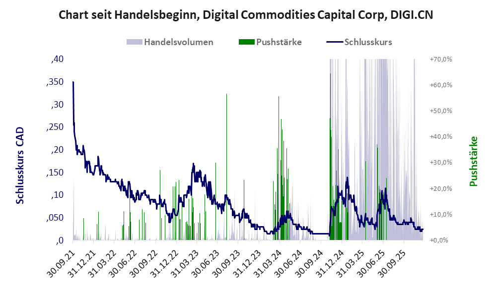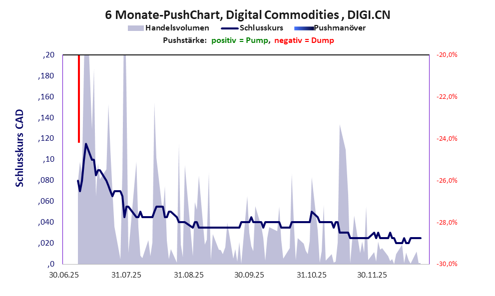 Typische Pusheraktie im Endstadium, deren Kursbildung im Algotrading-Modus erfolgt und deren PushScore alles besagt. *** Bei dieser Aktie liegt das „Inkassomodell“ vor, bei dem der Aktienkurs zu Beginn der Geschichte sein Allzeithoch hat. Ab dann verkaufen die Akteure nach und nach ihre billigst erworbenen Aktien, so dass der Kurs in verhältnismäßig kurzer Zeit abstürzt. Danach dümpelt der Aktienkurs in den meistn Fällen nahe null dahin und die Aktie dient nur noch kleineren, dennoch gewinnbringenden Pushmanövern und in vielen Fällen dem Algotrading. Dem ersten Einbruch nachfolgende größere Pushmanöver sind aber nicht ausgeschlossen.