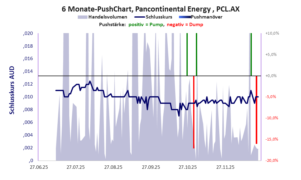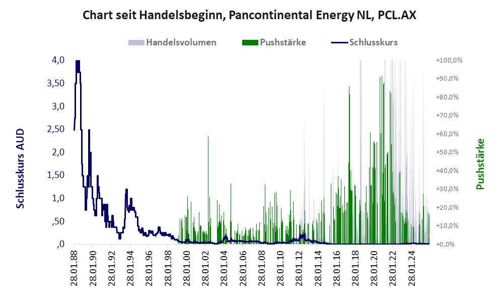Bei dieser Aktie liegt das „Inkassomodell“ vor, bei dem der Aktienkurs zu Beginn der Geschichte sein Allzeithoch hat. Die Akteure verkaufen schon zu Beginn nach und nach ihre billigst erworbenen Aktien, so dass der Kurs in verhältnismäßig kurzer Zeit abstürzt. Danach dümpelt der Aktienkurs in den meistn Fällen nahe null dahin und die Aktie dient nur noch kleineren, dennoch gewinnbringenden Pushmanövern und in vielen Fällen dem Algotrading. Dem ersten Einbruch nachfolgende größere Pushmanöver sind aber nicht ausgeschlossen.