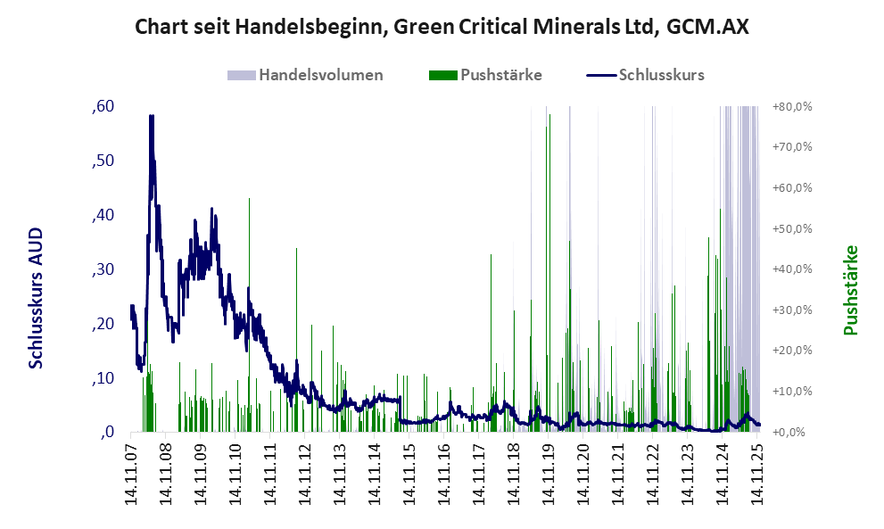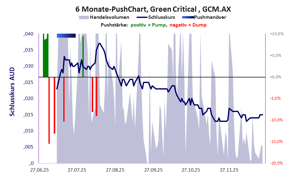 ein substanzloser Pusher mit verfallenem Kurs. Bei dieser Aktie liegt das „Inkassomodell“ vor, bei dem der Aktienkurs zu Beginn der Geschichte sein Allzeithoch hat. Die Akteure verkaufen schon zu Beginn nach und nach ihre billigst erworbenen Aktien, so dass der Kurs in verhältnismäßig kurzer Zeit abstürzt. Danach dümpelt der Aktienkurs in den meistn Fällen nahe null dahin und die Aktie dient nur noch kleineren, dennoch gewinnbringenden Pushmanövern und in vielen Fällen dem Algotrading. Dem ersten Einbruch nachfolgende größere Pushmanöver sind aber nicht ausgeschlossen. Bei dieser Aktie vollzogen die Akteure mindestens einen Pump & Dump und leerten damit ganz gezielt die Taschen der Anleger. Obwohl das Vorgehen rechtswidrig ist, erfolgt kaum je eine Strafverfolgung.