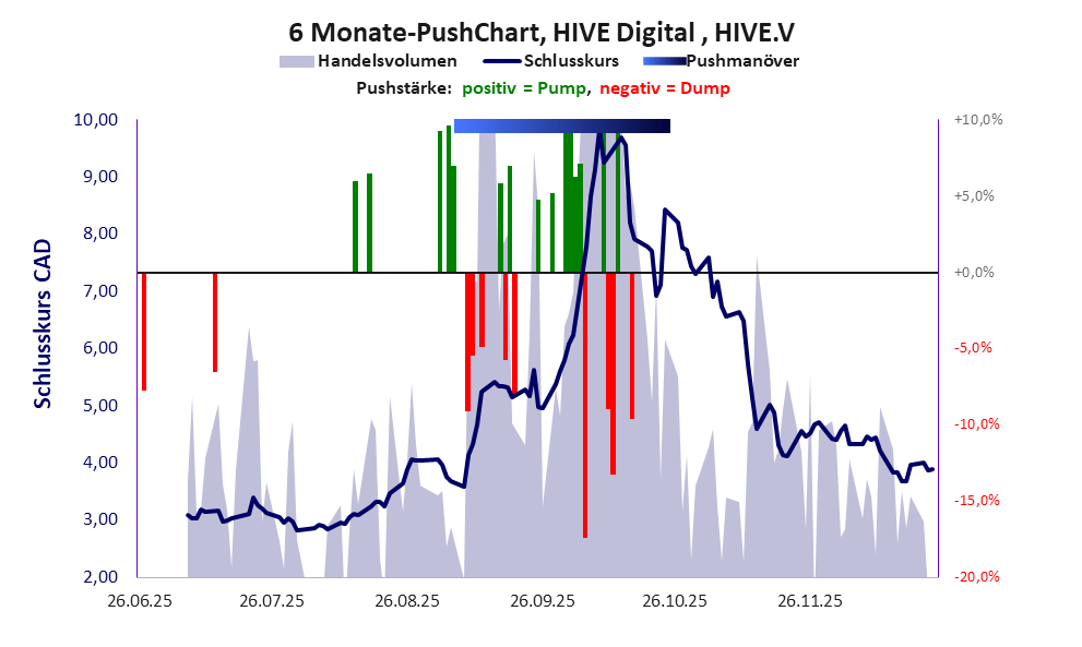 zeigt <abbr class='c2c-text-hover' title='bei einem Pushmanöver treiben Akteure und Medien den Aktienkurs manipulativ kurzfristig zum eigenen Vorteil nach oben.'>Pushmanöver</abbr> während der letzten sechs Monate