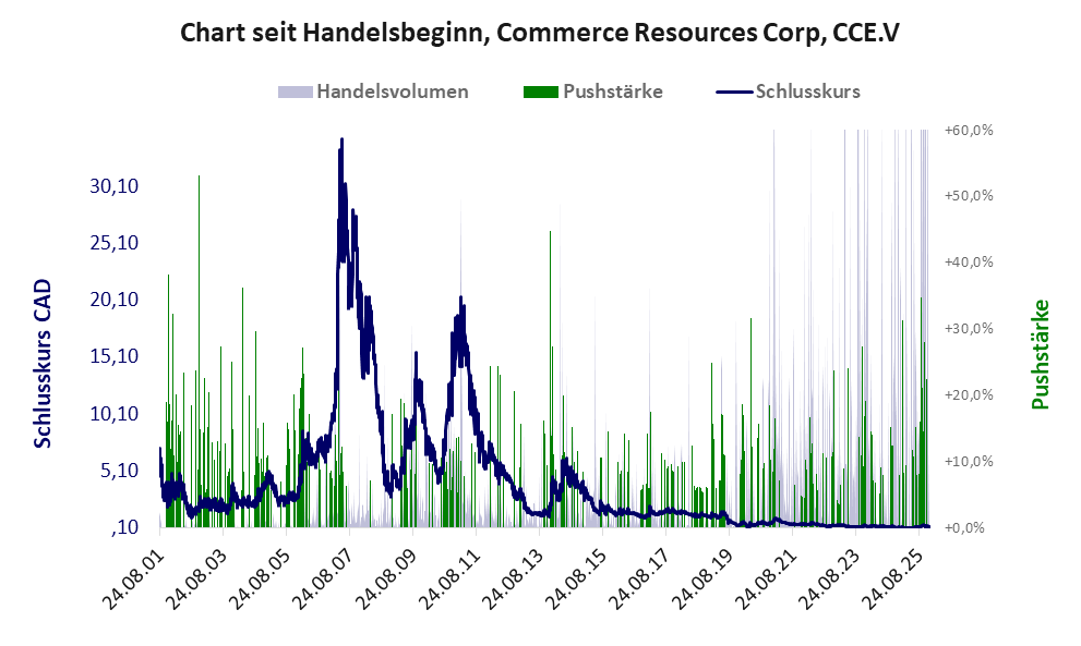 2023 betrugen die Explorationskosten 72,4 Mio. CAD (verbucht als Aktiva!). Gefunden wurde innerhalb von 25 Jahren nichts und nie wurde ein Profit erwirtschaftet. Die Commerce Resources ist eine Geldverbrennungsmaschine, die neben der Vernichtung der Investorengelder den Aktienkurs mehrfach pushte bis die Aktie völlig wertlos wurde.