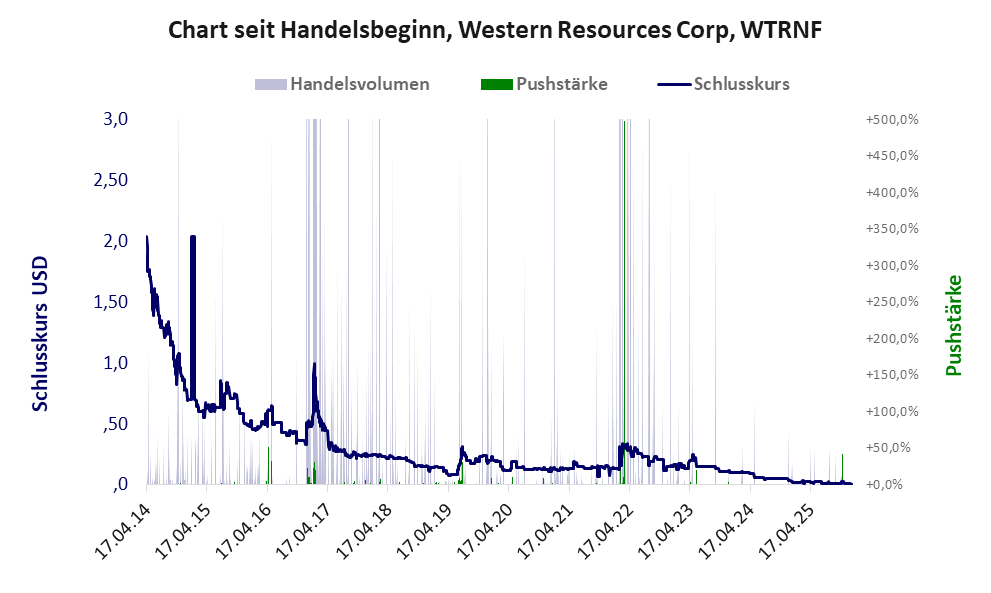 Bei dieser Aktie liegt das „Inkassomodell“ vor, bei dem der Aktienkurs zu Beginn der Geschichte sein Allzeithoch hat. Die Akteure verkaufen schon zu Beginn nach und nach ihre billigst erworbenen Aktien, so dass der Kurs in verhältnismäßig kurzer Zeit abstürzt. Danach dümpelt der Aktienkurs in den meistn Fällen nahe null dahin und die Aktie dient nur noch kleineren, dennoch gewinnbringenden Pushmanövern und in vielen Fällen dem Algotrading. Dem ersten Einbruch nachfolgende größere Pushmanöver sind aber nicht ausgeschlossen.