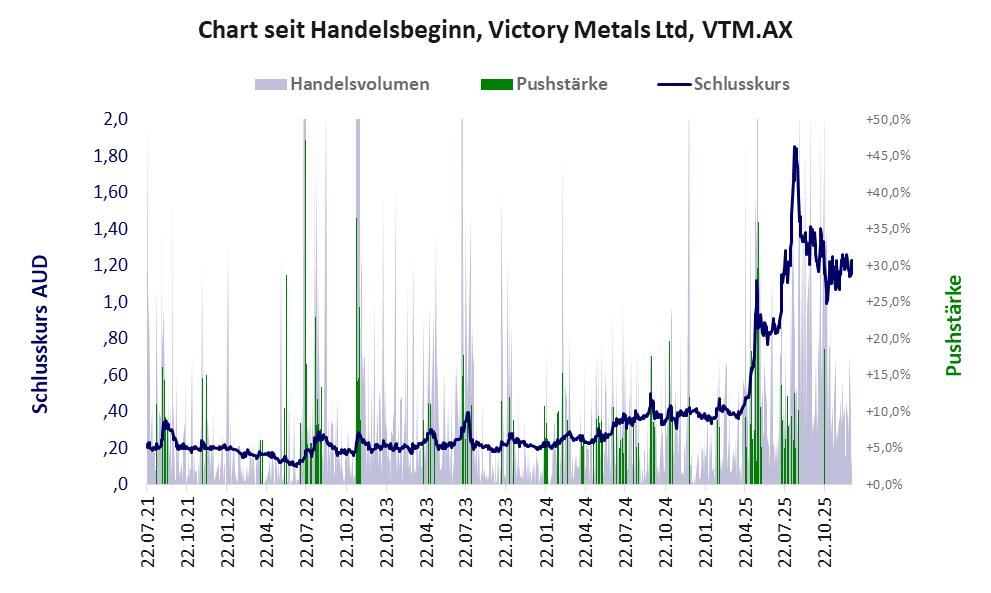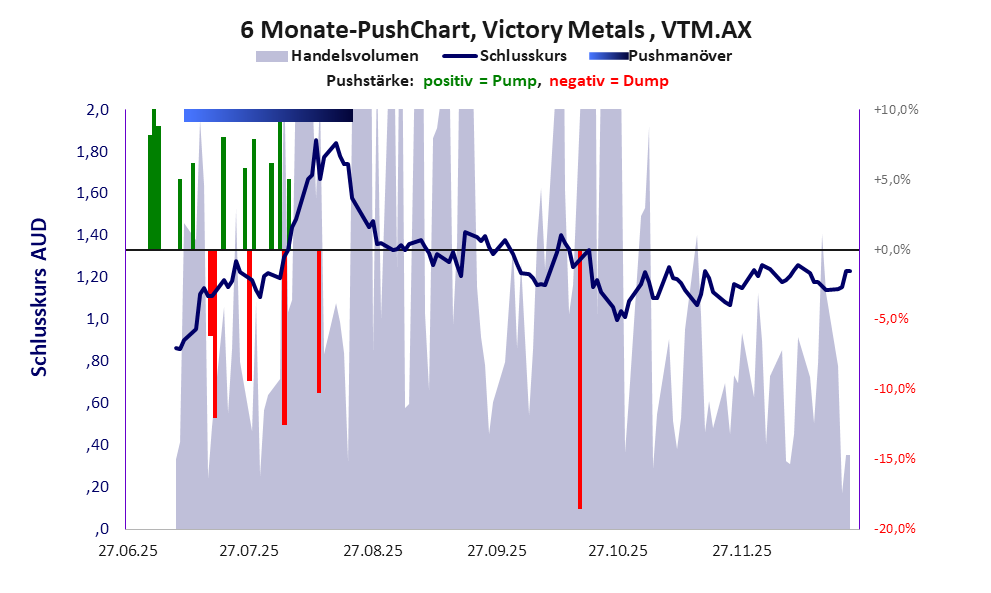 zeigt <abbr class='c2c-text-hover' title='bei einem Pushmanöver treiben Akteure und Medien den Aktienkurs manipulativ kurzfristig zum eigenen Vorteil nach oben.'>Pushmanöver</abbr> während der letzten sechs Monate