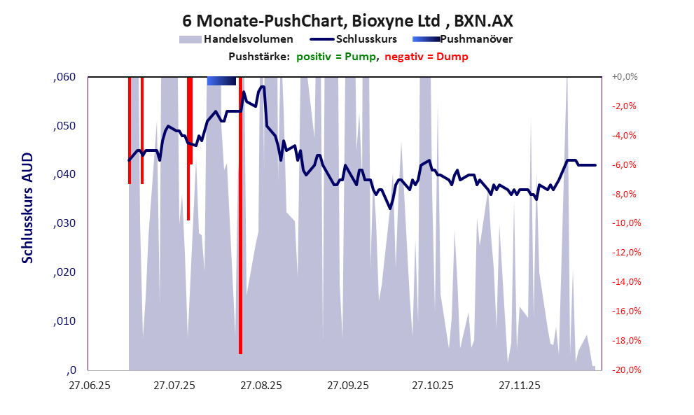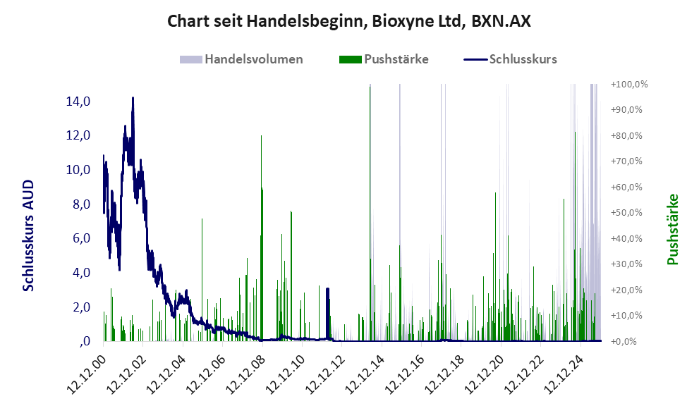Bei dieser Aktie liegt das „Inkassomodell“ vor, bei dem der Aktienkurs zu Beginn der Geschichte sein Allzeithoch hat. Die Akteure verkaufen schon zu Beginn nach und nach ihre billigst erworbenen Aktien, so dass der Kurs in verhältnismäßig kurzer Zeit abstürzt. Danach dümpelt der Aktienkurs in den meistn Fällen nahe null dahin und die Aktie dient nur noch kleineren, dennoch gewinnbringenden Pushmanövern und in vielen Fällen dem Algotrading. Dem ersten Einbruch nachfolgende größere Pushmanöver sind aber nicht ausgeschlossen.