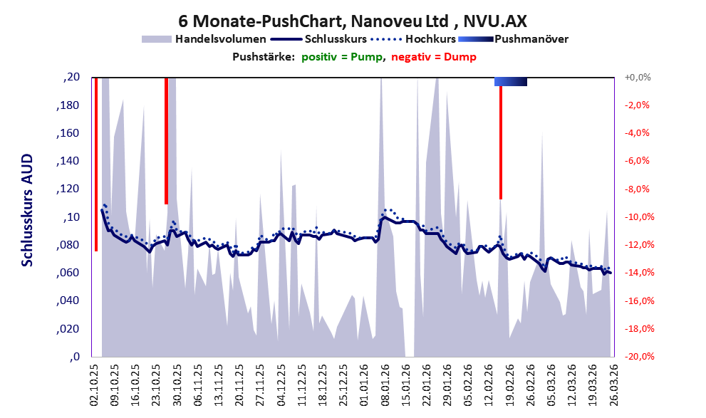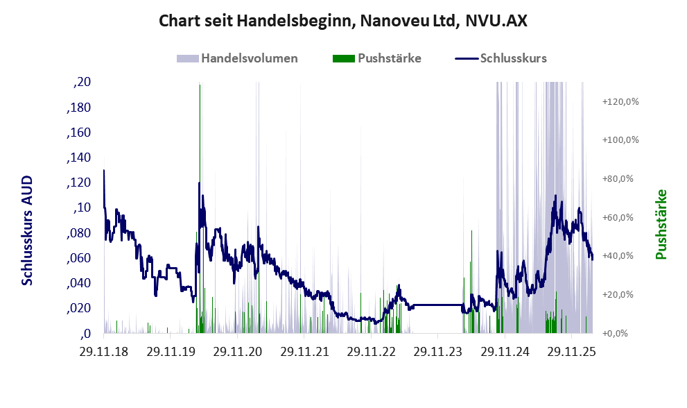 Bei dieser Aktie, über die w:o berichtet, liegt das Inkassomodell vor und es gibt 1 Pump & Dump-Manöver. Das tägliche Handelsvolumen betrug an obiger Börse während der letzten drei Monate bis Berichtsdatum: 2.834.270 Stück, das sind 0,3% der ausgegebenen Aktien. Bei Nanoveu Ltd rechtfertigt das schwache operative Geschäft nicht die Geldverbrennung.