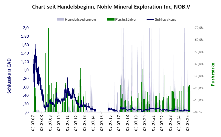 Noble Mineral hat ein kritisches Gesamtscoring und ist ein mickriger Pennystock mit praktisch einem Totalverlust. Das Gesamtvermögen ist überschaubar, die Vermögenswerte scheinen sehr werthaltig zu sein, der Umsatz ist nicht existent, die Ertragslage extrem verlustreich, die Geldverbrennung sehr hoch.
