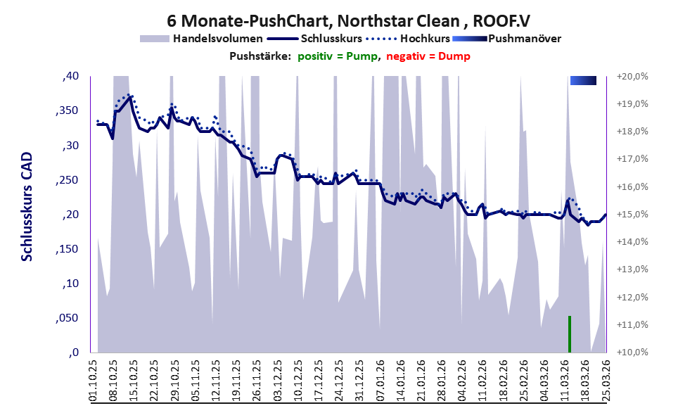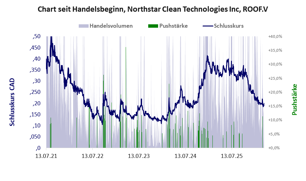 Über diese Aktie berichtet w:o. Das tägliche Handelsvolumen betrug an obiger Börse während der letzten drei Monate bis Berichtsdatum: 214.254 Stück, das sind 0,1% der ausgegebenen Aktien. Bei Northstar Clean rechtfertigt das schwache operative Geschäft nicht die Geldverbrennung.