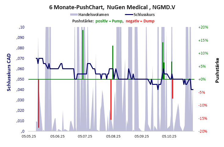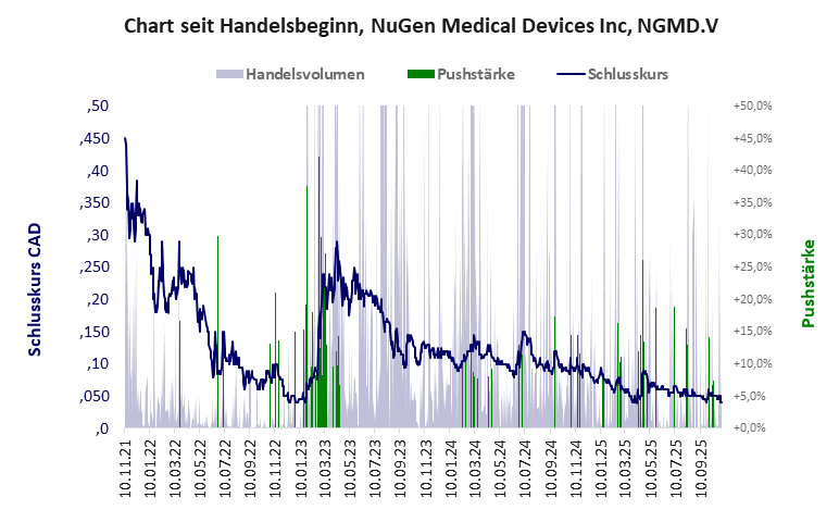 2018 startete die BuzBuz Capital Corp als Capital Pool Company und blieb ohne Geschäft bis Ende 2020. Das Geschäftsmotto war offenkundig„mal Augen offen halten, wo was geht“. Ende 2020 kaufte man die Anteile der Inolife R&D Inc und firmierte um zur NuGen Medical Devices Inc. Dass deren Geschäft nicht blüht, zeigt ein kurzer Blick in die Bilanz und wenn man sich das Netzwerk anschaut entdeckt man Bekannte wie etwa Drone Delivery oder Syntheia. Die Aktie lebt nur vom Kurspushing wie dem letzten im April 2025 von bullvestor angetriebenen. Anleger, Hände weg! NuGen Medical hat ein schlechtes Gesamtscoring und ist ein mickriger Pennystock mit einem riesigen Kursverlust. Das Gesamtvermögen ist überschaubar, die Vermögenswerte scheinen nicht vorhanden zu sein, der Umsatz ist überschaubar, die Ertragslage extrem verlustreich, die Geldverbrennung extrem hoch.