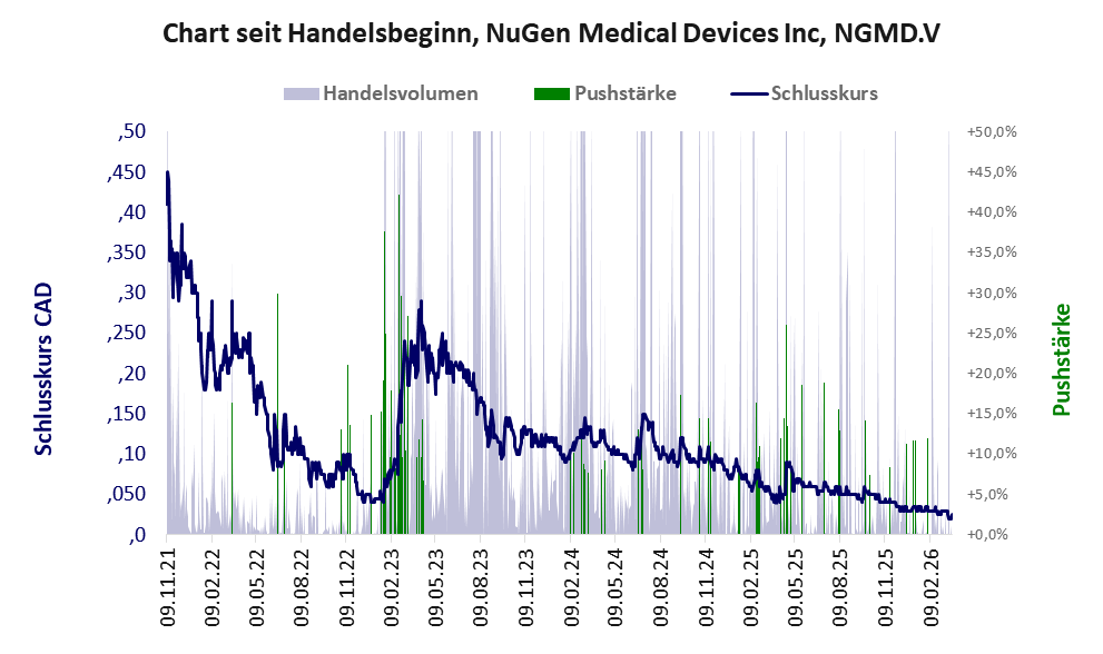 2018 startete die BuzBuz Capital Corp als Capital Pool Company, blieb aber bis Ende 2020 ohne Geschäft. Das Geschäftsmotto war offenkundig, „mal Augen offen halten, wo was geht“. Ende 2020 kaufte man die Anteile der Inolife R&D Inc und firmierte um zur NuGen Medical Devices Inc. Dass deren Geschäft nicht blüht, zeigt ein Blick in die Bilanz und wenn man sich das Netzwerk anschaut, entdeckt man Bekannte wie etwa Drone Delivery oder Syntheia. Die Aktie lebt vom Kurspushing. Anleger, Hände weg!