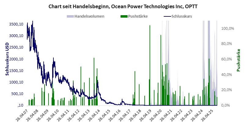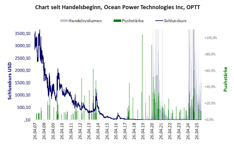 ein kleiner Mittelständler mit hohen Verlusten, dessen technologische Innovation nicht zum Durchbruch kommt und der Aktienkurs daher ein Trauerspiel darstellt. Das versucht man durch massive Pushmanöver zu korrigieren, wovon das letzte im Nov./Dez. 2024 stattfand und den Kurs erheblich ansteigen ließ. Von Dauer wird das nicht sein, solange keine harten Fakten folgen. Ocean Power hat ein schlechtes Gesamtscoring und ist ein Pennystock mit praktisch einem Totalverlust. Das Gesamtvermögen ist überschaubar, die Vermögenswerte scheinen wenig werthaltig zu sein, der Umsatz ist überschaubar, die Ertragslage extrem verlustreich, die Geldverbrennung extrem hoch.