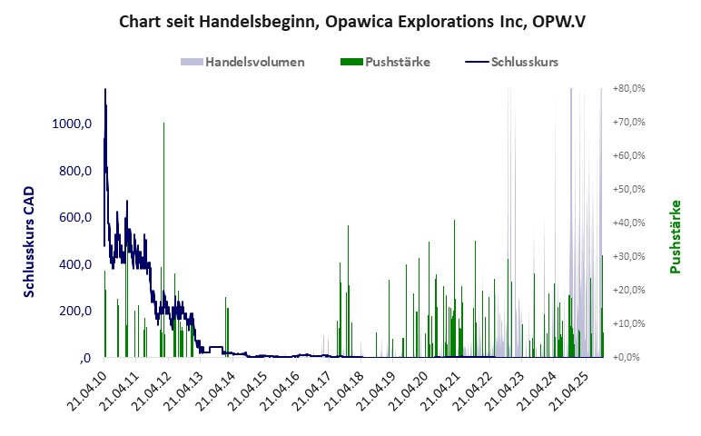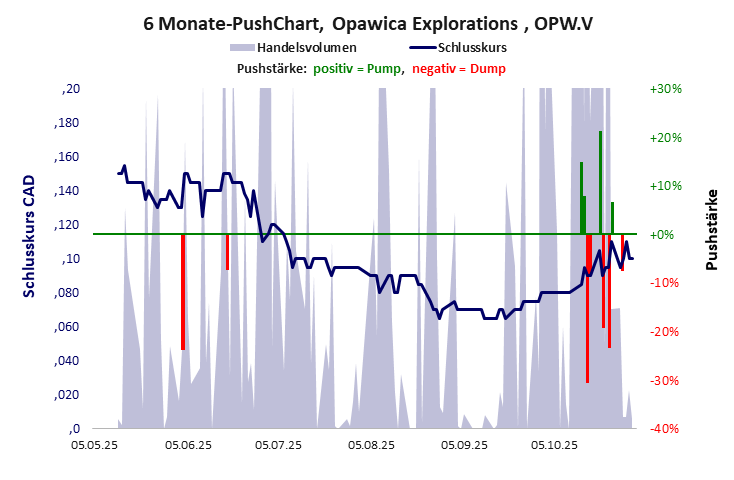 Trotz starker Pushmanöver brach der Aktienkurs im Laufe der ersten drei Jahre zusammen. Weitere Pushmanöver folgten trotz flachen Kurses bis zum letzten im Okt./Nov. 2024. Von einer völlig wertlosen Firma wird dem Publikum ein furioser Erfolg vorgegaukelt. Opawica Explorations hat ein kritisches Gesamtscoring und ist ein mickriger Pennystock mit praktisch einem Totalverlust. Das Gesamtvermögen ist überschaubar, die Vermögenswerte scheinen sehr werthaltig zu sein, der Umsatz ist nicht existent, die Ertragslage extrem verlustreich, die Geldverbrennung extrem hoch.