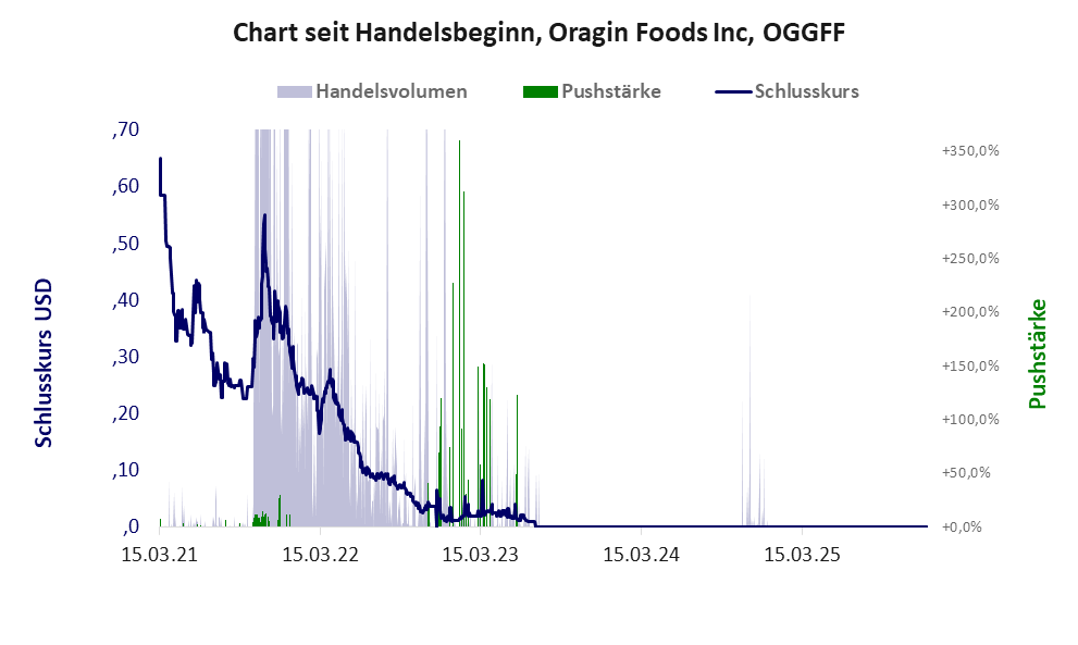 Bei dieser Aktie liegt das „Inkassomodell“ vor, bei dem der Aktienkurs zu Beginn der Geschichte sein Allzeithoch hat. Die Akteure verkaufen schon zu Beginn nach und nach ihre billigst erworbenen Aktien, so dass der Kurs in verhältnismäßig kurzer Zeit abstürzt. Danach dümpelt der Aktienkurs in den meistn Fällen nahe null dahin und die Aktie dient nur noch kleineren, dennoch gewinnbringenden Pushmanövern und in vielen Fällen dem Algotrading. Dem ersten Einbruch nachfolgende größere Pushmanöver sind aber nicht ausgeschlossen. Bei dieser Aktie vollzogen die Akteure mindestens einen Pump & Dump und leerten damit ganz gezielt die Taschen der Anleger. Obwohl das Vorgehen rechtswidrig ist, erfolgt kaum je eine Strafverfolgung.