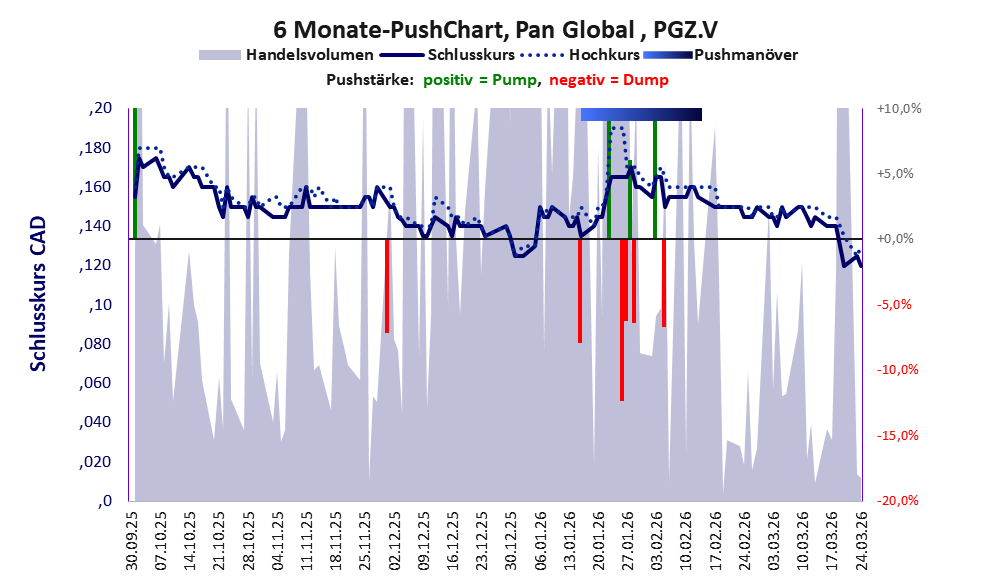 Bei dieser Aktie, über die w:o berichtet, gibt es 1 Pump & Dump-Manöver. Das tägliche Handelsvolumen betrug an obiger Börse während der letzten drei Monate bis Berichtsdatum: 372.306 Stück, das sind 0,1% der ausgegebenen Aktien. In Aktien der Klasse V darf man grundsätzlich nicht investieren. Es gibt keinen ordentlichen Geschäftsbetrieb. Die Aktie hat nur den Zweck, mit Pushmanövern oder Algotrading an der Börse Kasse zu machen.