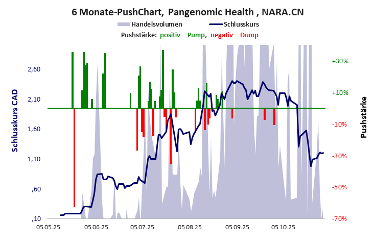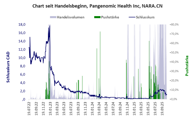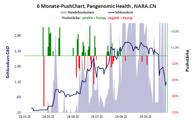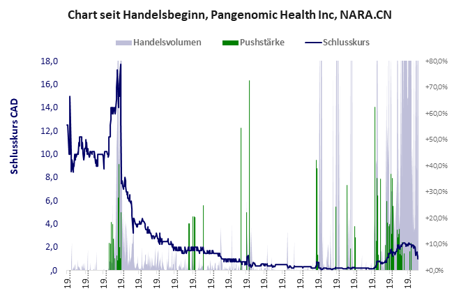 Pangenomic Health dient nur zum Aktienpushing! Einen riesigen Pusherfolg hatte die Aktie bereits Anfang 2022, der nach Schätzrechnung 16 Mio. CAD eingebracht haben könnte. Aktuell folgt ein weiteres Pushmanöver, begleitet durch Werbung von Apaton – und es funktioniert offenbar mit großem Erfolg! Pangenomic Health hat ein inakzeptables Gesamtscoring und ist eine billige Aktie mit einem riesigen Kursverlust. Das Gesamtvermögen ist nahezu null, die Vermögenswerte scheinen nicht werthaltig zu sein, der Umsatz ist nicht existent, die Ertragslage extrem verlustreich, die Geldverbrennung extrem hoch.