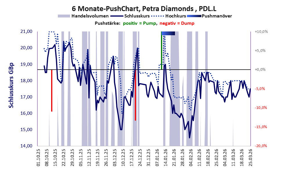 Die Pushstärke ist umso höher, je stärker die Kurse vom durchschnittlichen Verlauf abweichen und daher ein Verdacht auf Kursmanipulation besteht.