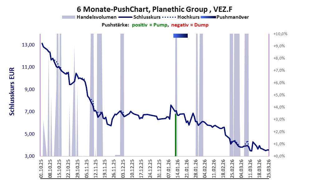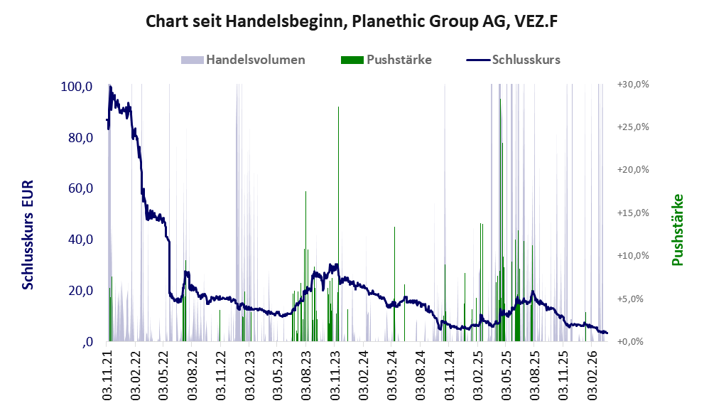 Über diese Aktie berichtet Apaton. Das tägliche Handelsvolumen betrug an obiger Börse während der letzten drei Monate bis Berichtsdatum: 236 Stück, das sind 0,0% der ausgegebenen Aktien. Bei Planethic Group wird bei schwachen operativen Geschäft zu viel Geld verbrannt.
