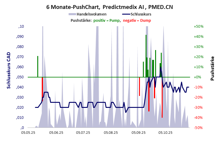 ein Habenichts mit gepushtem Kurs in großem Netzwerk. Der Kurs ist nahe null, die Aktie wertlos. Predictmedix AI hat ein inakzeptables Gesamtscoring und ist ein mickriger Pennystock mit einem starken Kursverlust. Das Gesamtvermögen ist karg, die Vermögenswerte scheinen wenig werthaltig zu sein, der Umsatz ist mickrig, die Ertragslage extrem verlustreich, die Geldverbrennung extrem hoch.