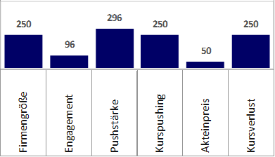 Ob eine Aktie als Pusheraktie einzustufen ist, wird an Hand von sechs Kenngrößen ermittelt, von denen die Pushstärke das größte Gewicht hat. Die Bewertungssumme der sechs Kenngrößen ergibt multipliziert mit dem Faktor aus dem Medienpushing den PushScore. Da alle Aktiendaten sich im Laufe Zeit verändern, ist der PushScore keine Konstante, sondern ändert sich mit der Zeit.