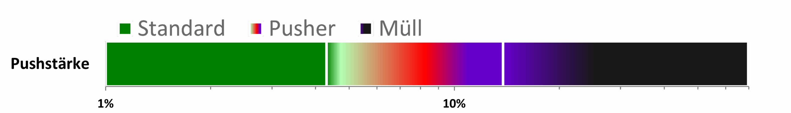 Mit der Pushstärke werden die Kursspannen der Tageskurse analysiert, wie weit sie vom durchschnittlichen Wert vergangener Tage abweichen und jene herausgefiltert, die einen Schwellenwert überschreiten. Die Pushstärke ist die prozentuale Abweichung jüngster Tagesschlusskurse vom mittleren Tageskurs vergangener Tage. Die Auswertungen ergeben: bis 4,4% reicht die Standardzone und bereits ab 10% beginnt die Müllzone mit fließendem Übergang zu Pusheraktien im Bereich von 10 bis 15%. Die Zonengrenzen lassen sich aus der bestmöglichen Trennbarkeit der Aktienklassen ableiten.