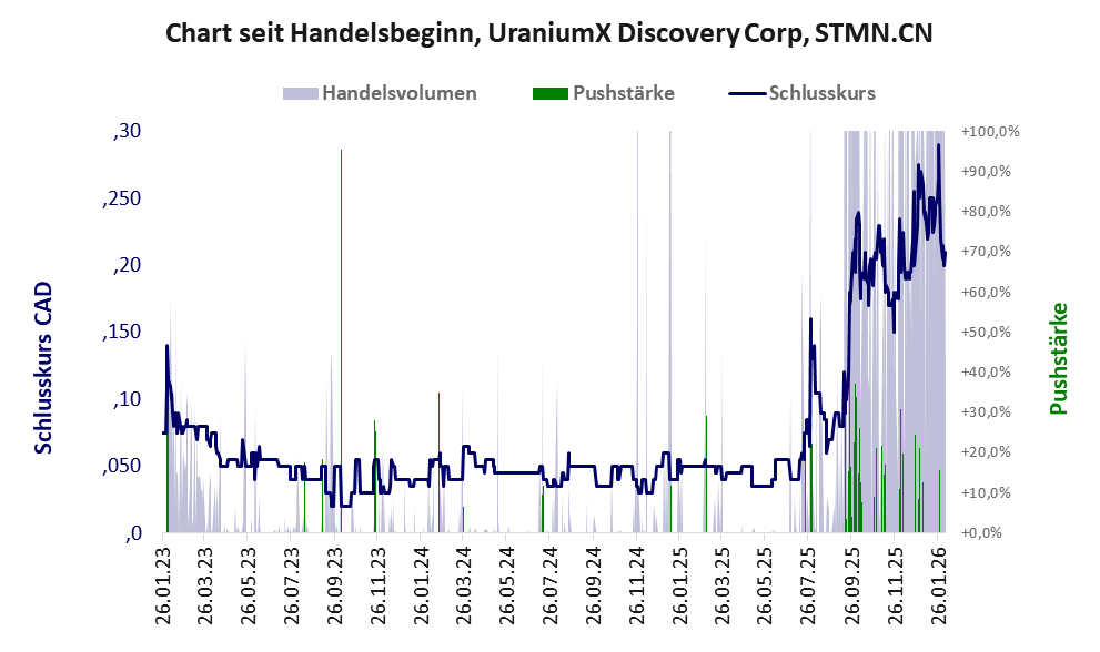 Das tägliche Handelsvolumen während der letzten drei Monate (bis Berichtsdatum) betrug 154.768 Stück, das sind 0,2% der ausgegebenen Aktien. Die Kurshistorie dieser Aktie fehlt seit dem Start am 23.01.23 bis zum Relaunch am 26.01.23.