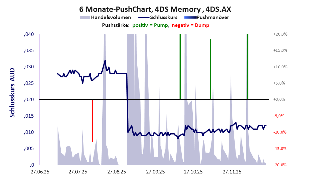 Bei dieser Aktie liegt das „Inkassomodell“ vor, bei dem der Aktienkurs zu Beginn der Geschichte sein Allzeithoch hat. Die Akteure verkaufen schon zu Beginn nach und nach ihre billigst erworbenen Aktien, so dass der Kurs in verhältnismäßig kurzer Zeit abstürzt. Danach dümpelt der Aktienkurs in den meistn Fällen nahe null dahin und die Aktie dient nur noch kleineren, dennoch gewinnbringenden Pushmanövern und in vielen Fällen dem Algotrading. Dem ersten Einbruch nachfolgende größere Pushmanöver sind aber nicht ausgeschlossen. Bei dieser Aktie vollzogen die Akteure mindestens einen Pump & Dump und leerten damit ganz gezielt die Taschen der Anleger. Obwohl das Vorgehen rechtswidrig ist, erfolgt kaum je eine Strafverfolgung.