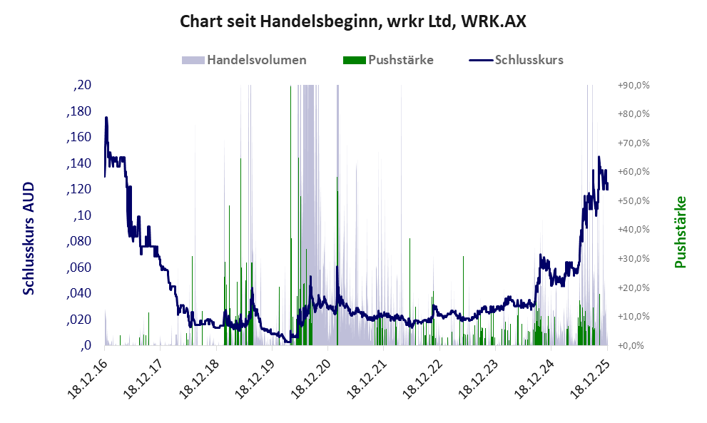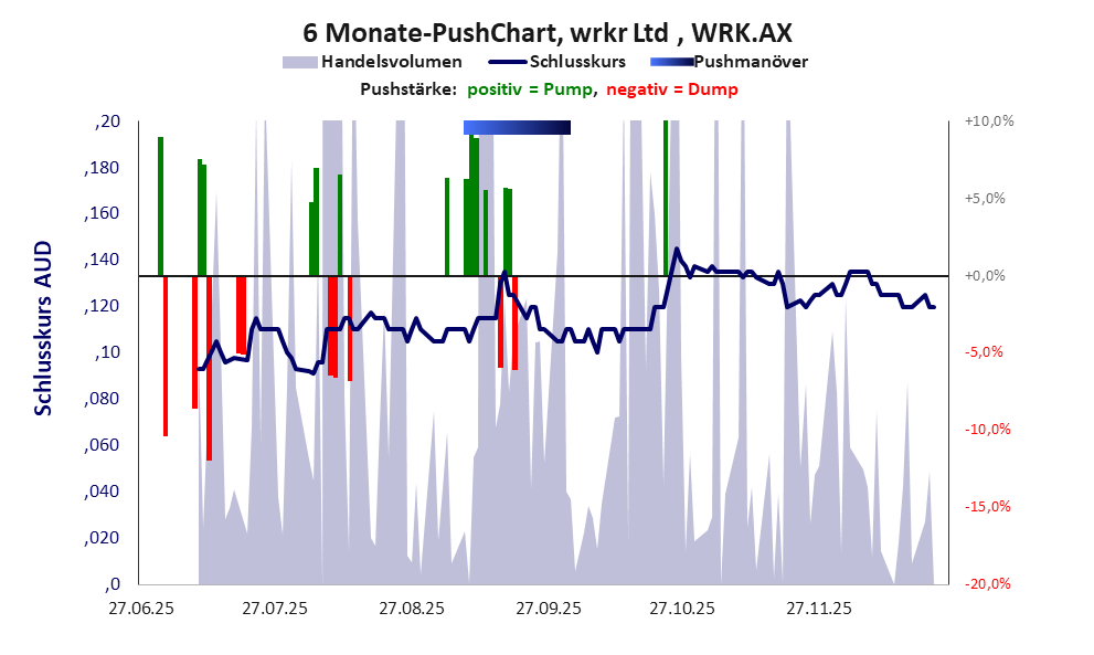 Bei dieser Aktie liegt das „Inkassomodell“ vor, bei dem der Aktienkurs zu Beginn der Geschichte sein Allzeithoch hat. Die Akteure verkaufen schon zu Beginn nach und nach ihre billigst erworbenen Aktien, so dass der Kurs in verhältnismäßig kurzer Zeit abstürzt. Danach dümpelt der Aktienkurs in den meistn Fällen nahe null dahin und die Aktie dient nur noch kleineren, dennoch gewinnbringenden Pushmanövern und in vielen Fällen dem Algotrading. Dem ersten Einbruch nachfolgende größere Pushmanöver sind aber nicht ausgeschlossen.