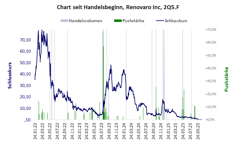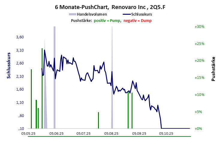 Renovaro Inc hat ein schlechtes Gesamtscoring und ist ein mickriger Pennystock mit praktisch einem Totalverlust. Das Gesamtvermögen ist überschaubar, die Vermögenswerte scheinen wenig werthaltig zu sein, der Umsatz ist nicht existent, die Ertragslage extrem verlustreich, die Geldverbrennung extrem hoch.