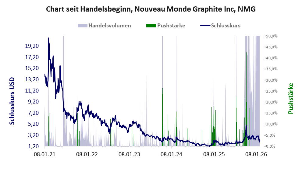 Nouveau Monde besticht in erster Linie durch die hohe jährliche Geldverbrennung. Bei dieser Aktie liegt das Refreshmodell vor. Das tägliche Handelsvolumen betrug an obiger Börse während der letzten drei Monate bis Berichtsdatum: 788.280 Stück, das sind 0,5% der ausgegebenen Aktien.
