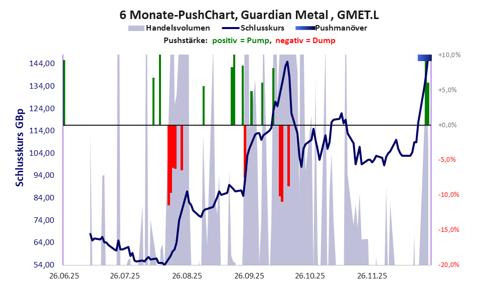 zeigt <abbr class='c2c-text-hover' title='bei einem Pushmanöver treiben Akteure und Medien den Aktienkurs manipulativ kurzfristig zum eigenen Vorteil nach oben.'>Pushmanöver</abbr> während der letzten sechs Monate