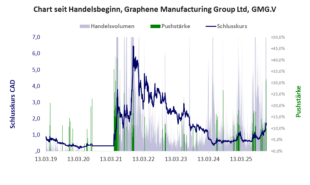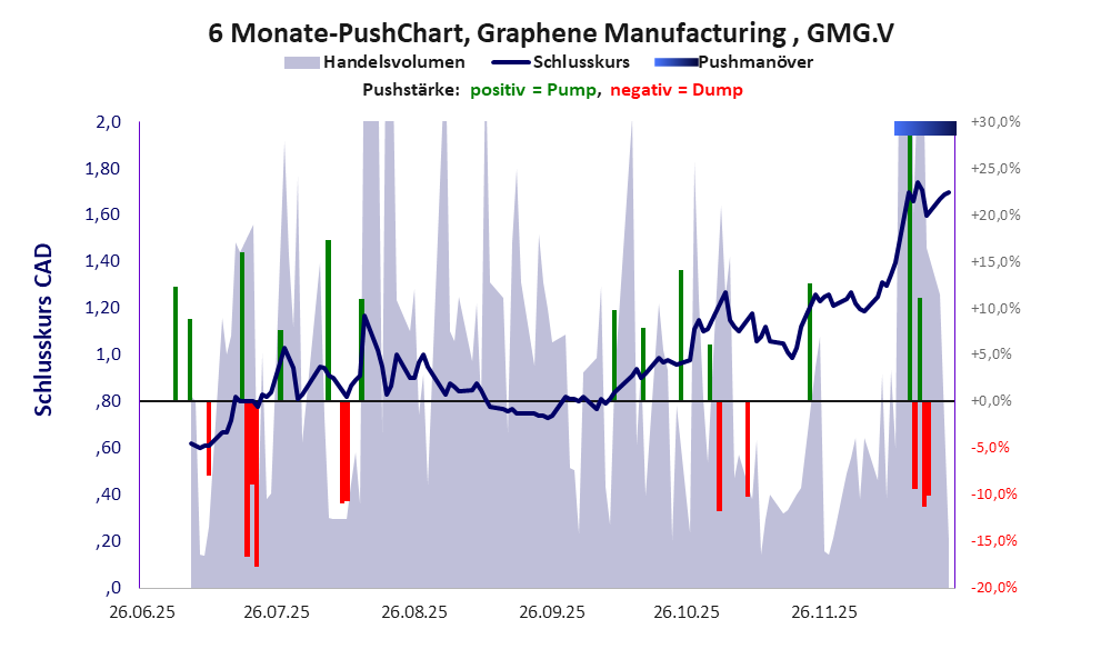 zeigt <abbr class='c2c-text-hover' title='bei einem Pushmanöver treiben Akteure und Medien den Aktienkurs manipulativ kurzfristig zum eigenen Vorteil nach oben.'>Pushmanöver</abbr> während der letzten sechs Monate