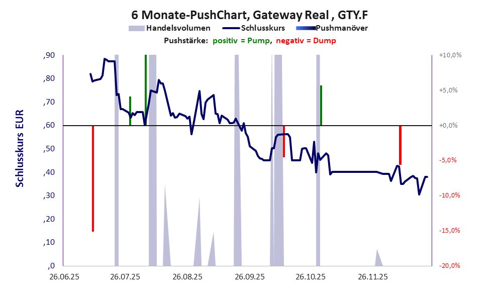 zeigt <abbr class='c2c-text-hover' title='bei einem Pushmanöver treiben Akteure und Medien den Aktienkurs manipulativ kurzfristig zum eigenen Vorteil nach oben.'>Pushmanöver</abbr> während der letzten sechs Monate
