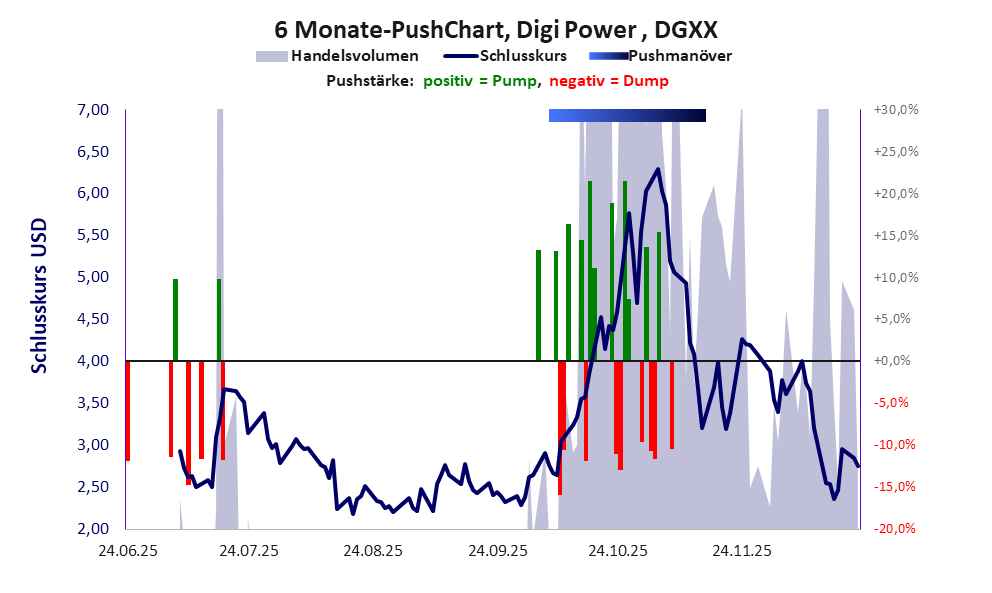 zeigt <abbr class='c2c-text-hover' title='bei einem Pushmanöver treiben Akteure und Medien den Aktienkurs manipulativ kurzfristig zum eigenen Vorteil nach oben.'>Pushmanöver</abbr> während der letzten sechs Monate