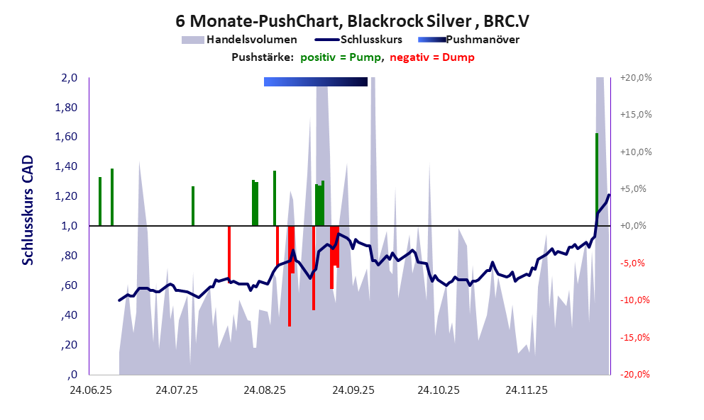 zeigt <abbr class='c2c-text-hover' title='bei einem Pushmanöver treiben Akteure und Medien den Aktienkurs manipulativ kurzfristig zum eigenen Vorteil nach oben.'>Pushmanöver</abbr> während der letzten sechs Monate