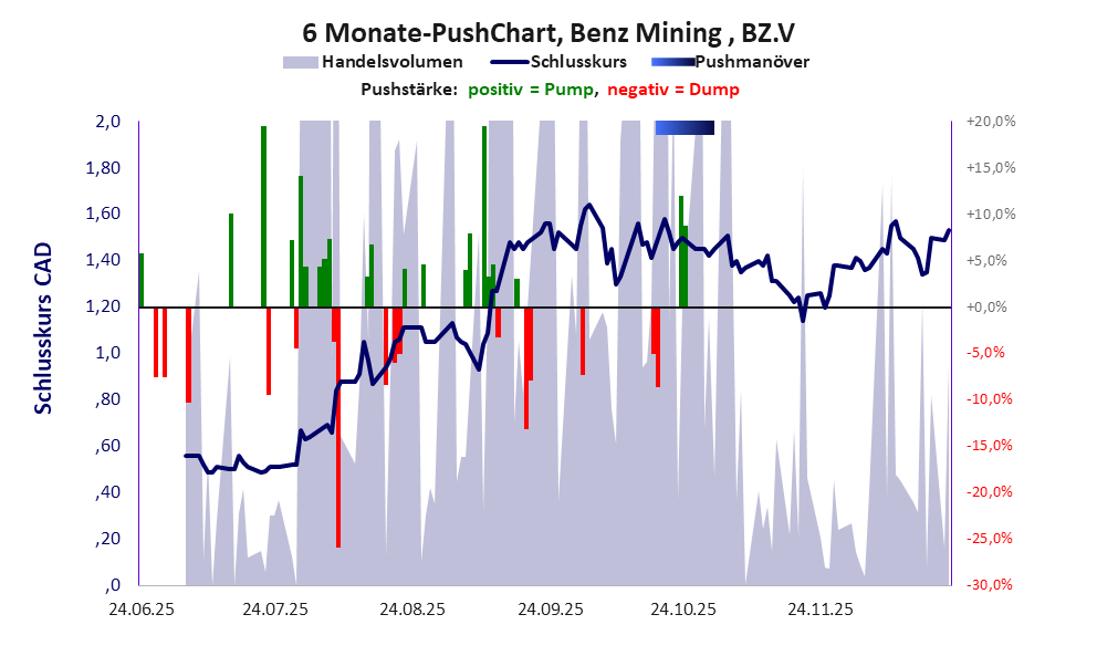 zeigt <abbr class='c2c-text-hover' title='bei einem Pushmanöver treiben Akteure und Medien den Aktienkurs manipulativ kurzfristig zum eigenen Vorteil nach oben.'>Pushmanöver</abbr> während der letzten sechs Monate